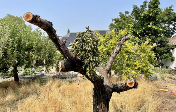 Last summer, I decided to kill this apricot tree. We weren’t using the apricots, it was making a mess, and I wanted to do something else with the spot it’s in. So, I cut off the branches, drilled holes in the stumps, and poured undiluted Round-Up into them. And yet, you’ll notice that there’s a spot on one branch that has sprouted shoots and leaves this summer.